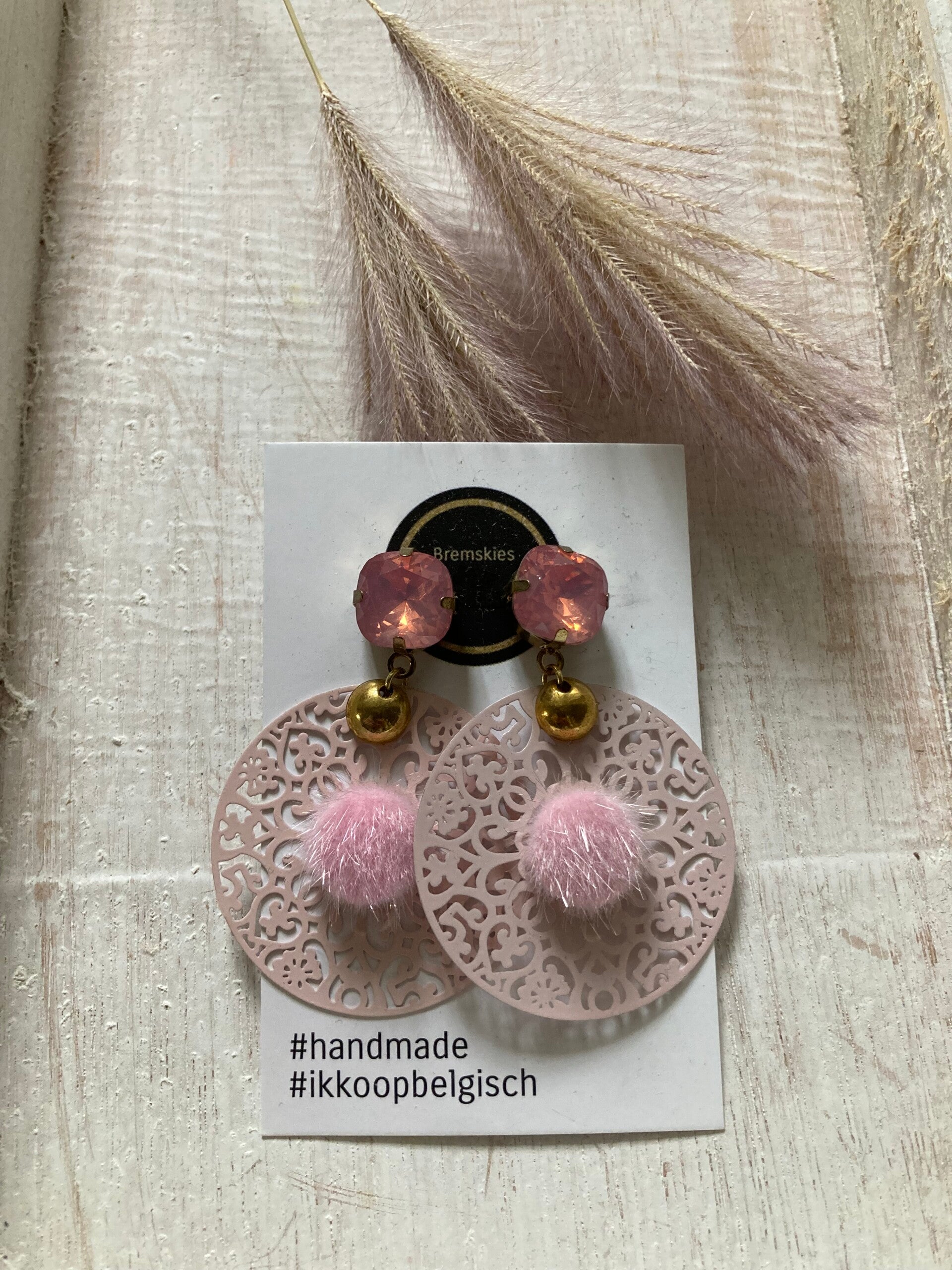 Deze oorbellen zijn afgewerkt met goudkleur en bevatten een glassteen in het roze. Met de pluisjes maken deze oorbellen je outfit helemaal af voor de winter