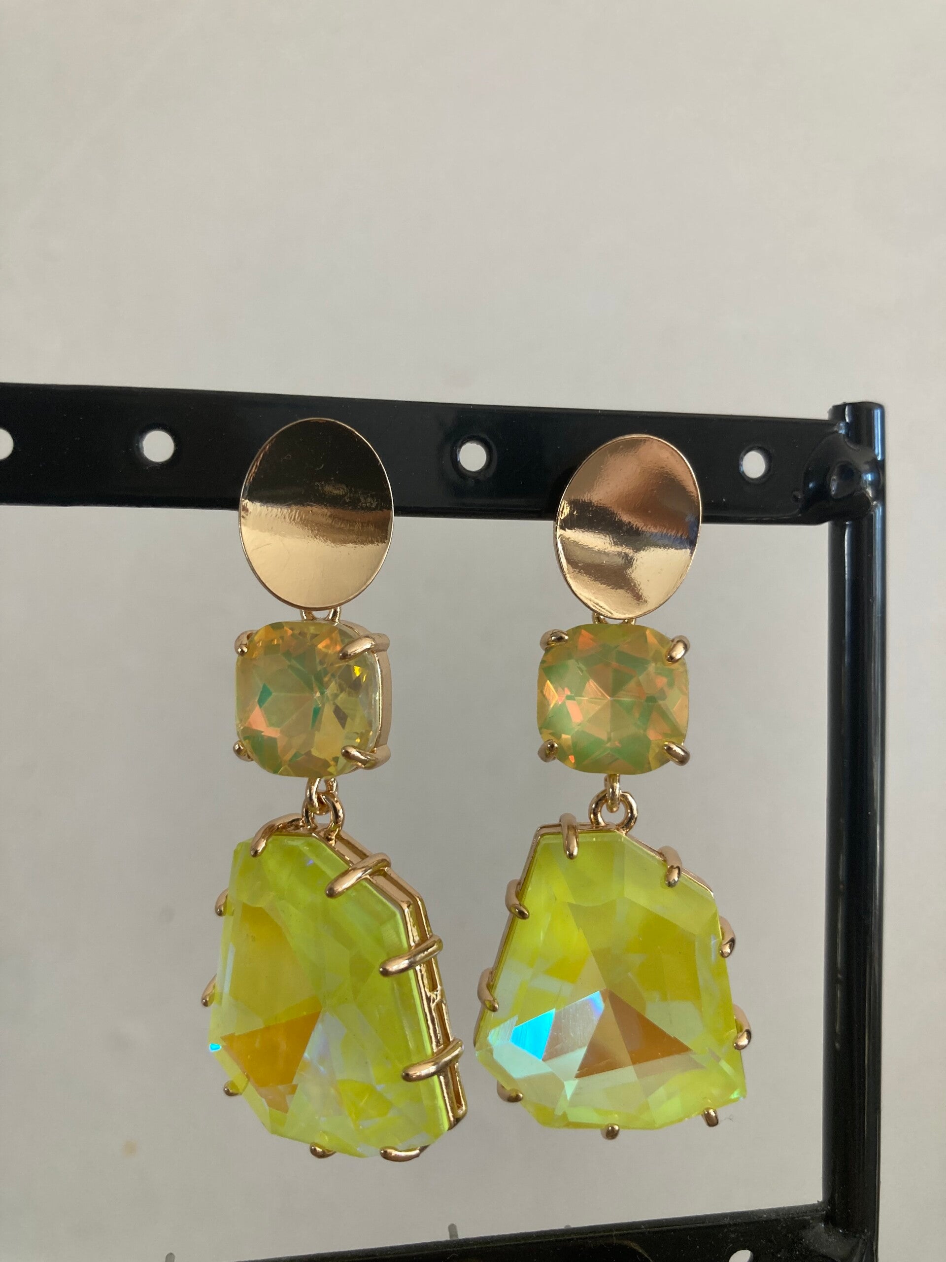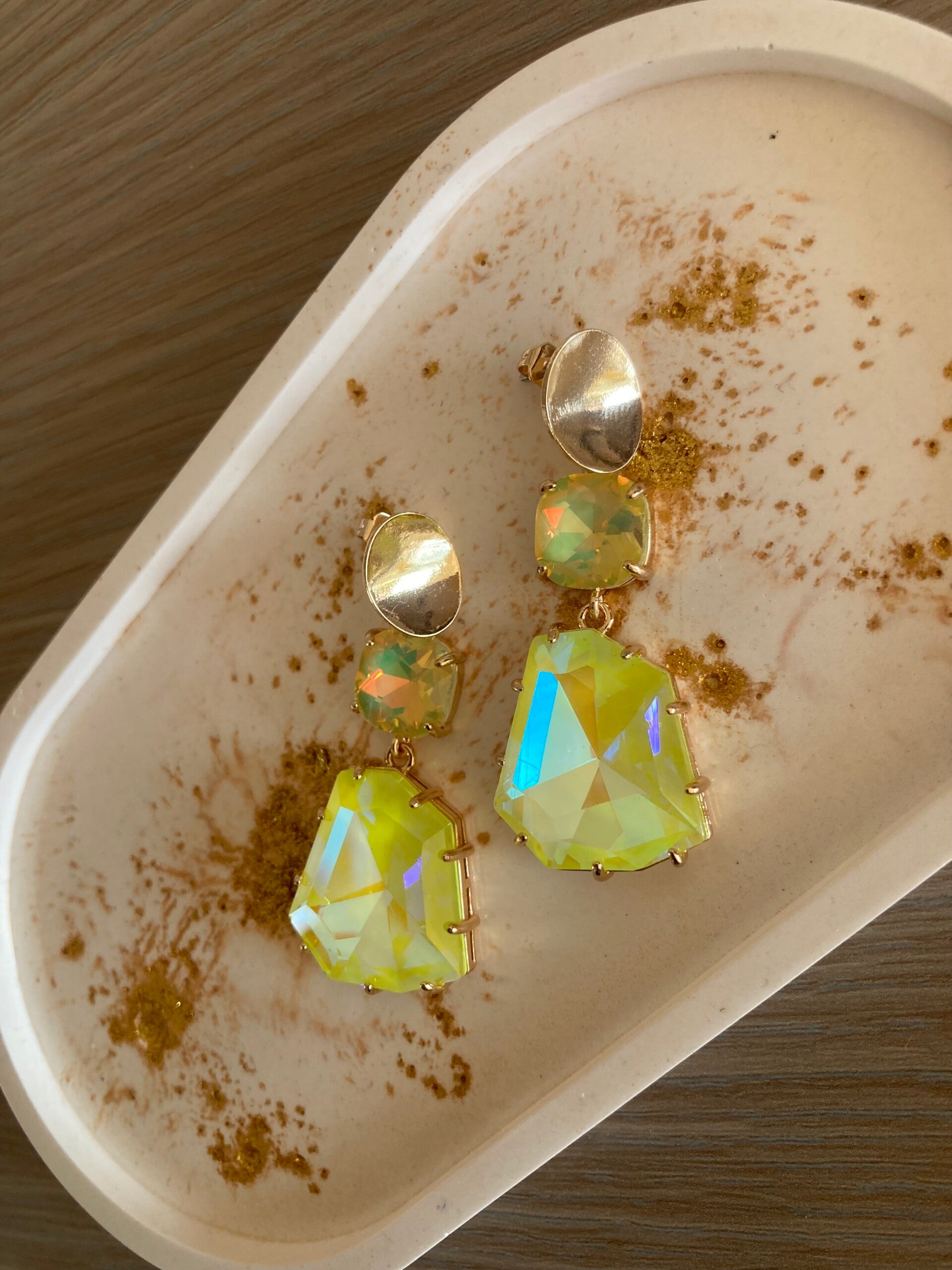 Sol, onze meest fleurige paar oorbellen uit de collectie. Gemaakt uit een goudkleurige oorsteker met gele tussensteen en een veelhoekige fluogele hanger.